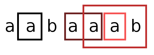 With \(i=5\) and \(r=5\) we reach case 2 for the first time. \(k=i-l+1=2\) so our similar position at the beginning of \(S\) is position 2. \(Z_2=1\) and \(r-i+1=1\) so we are in case 2b and have to find the shared prefix of \(S[2 ..]\) (\(abaaab\)) and \(S[6 ..]\) (\(ab\)). It’s \(ab\), so \(p=2\) and \(Z_5=r-i+1+p=3\). \(l=5\) and \(r=7\).