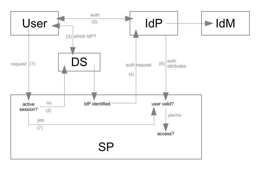 - There is no active session on the SP, so the user is linked to a Discovery Service (DS) (2).