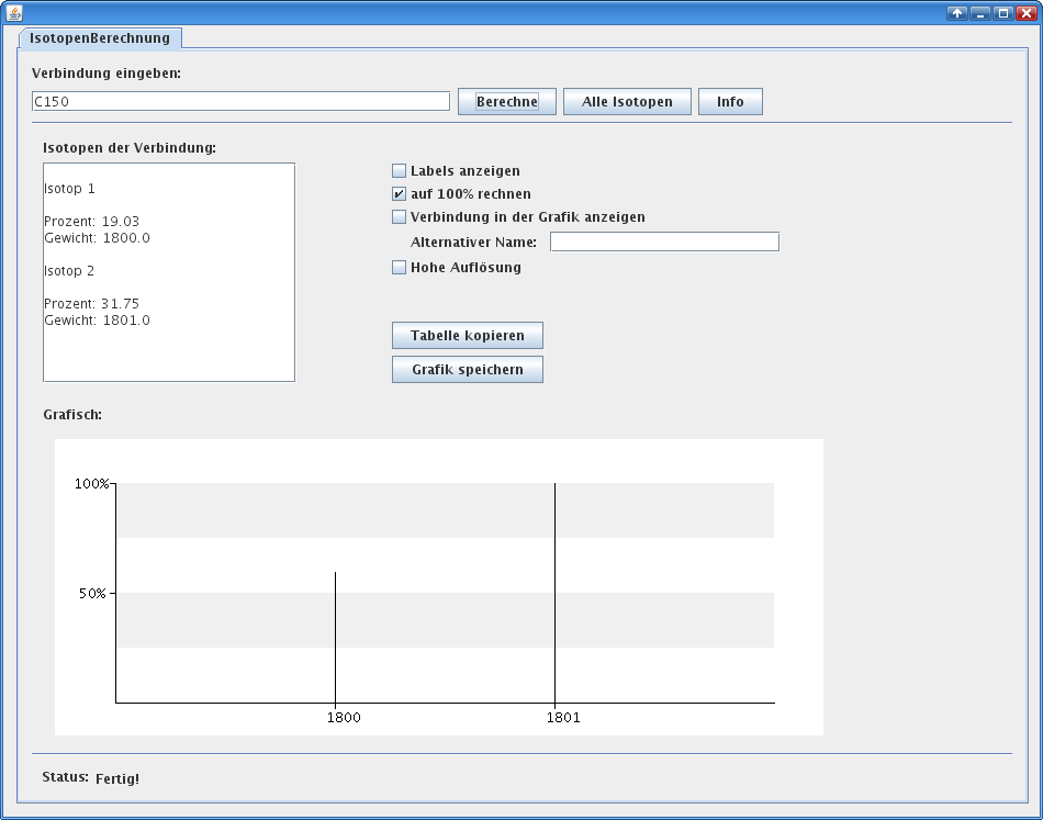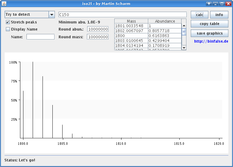 And while I’m touching the code, I translated the tool to English, increased the isotopic accuracy and added some more features. In figure 1 you can see the output of version 1 for \(\text{C}_{150}\). As I told this version loses many peaks. I contrast you can see the output of version 2 for the same compound in figure 2. Here the real isotopic cluster is visible.