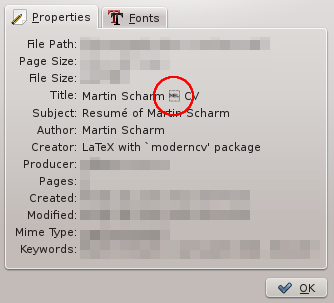 Using moderncv you can produce really fancy CV’s with very little effort. But unfortunately, by default it produces an ugly title (see the screenshot taken from Okular). As you can see, there is some character that cannot be displayed by certain tools.