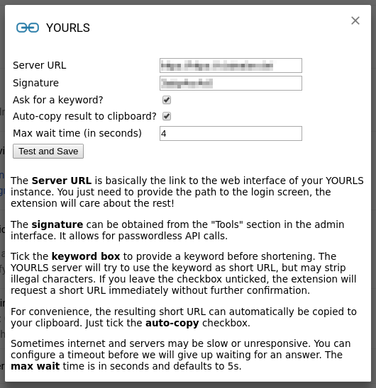 - Ask for a keyword?: Should the extension ask for a keyword before shortening? If this box is checked you’ll always be asked for a keyword before shortening. You may still leave the keyword field empty to let YOURLS assign a keyword automatically. If you leave this box unticked: clicking the toolbar button will immediately shorten the URL without any other interaction required.