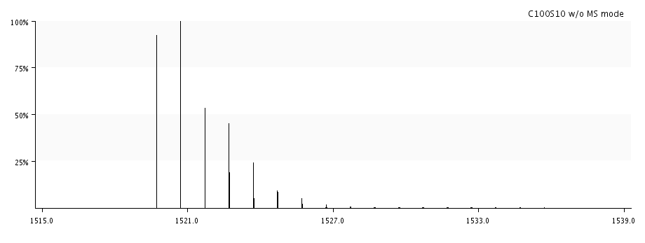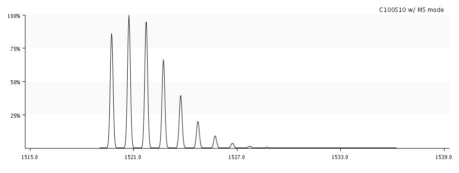 - MS mode displays the isotopic pattern as expected by mass spectrometry instruments. Without this mode you'll see a theoretical graphic, each isotope gives a single peak. But MS instruments aren't able to distinguish between two peak with a mass of ±0.000001 m/z. If you enable MS mode the tool a peak is converted to a normal distribution, its variance is approximated by the resolution of the MS instrument. You can define the FWHM resolution in the text field. Compare figures 2 and 3, especially look take a look at the peak at ≈1521.7. Without MS mode this peaks is much smaller, because it contains many overlying peaks. With MS mode enabled these peak-distributions support each other.