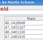 The results are displayed in form of a table and a graphic. The table contains masses and abundances of each peak. Its initially sorted by abundances, but you can resort the values by clicking the header. The graphic contains a visual feedback of the isotopic cluster. If you hover with your mouse you’ll see the abundance and mass at this point. You can zoom into a specific mass window, just right click on one border of the mass window to show and move to the other boundary before releasing the right button. Of course you can zoom into an area of this area again. Double-click to switch one zoom back, or right-click and choose Full unzoom to get back to the initial zoom level.