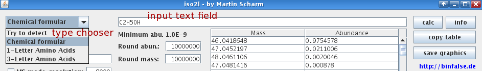To compute an isotopic distribution of a compound type its chemical formula to the upper text field. The tool is also able to determine the elemental composition from amino acid chains. It tries to guess the type of input, if that fails you can give a hint with the chooser in the upper left corner, see figure 1.