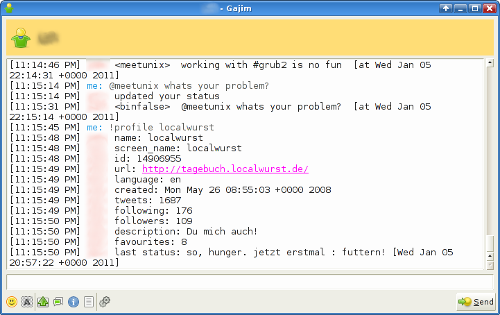 This bot is sending you news from Twitter to your Jabber account and sending status updates from Jabber to Twitter. It’s free, open source and after some setup it’s very easy to use! A sample usage of interact with the bot from Gajim can be seen in figure 1.